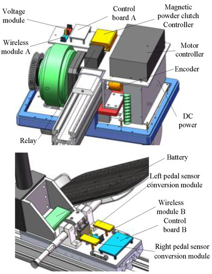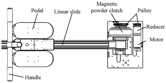 The leg-training device mainly consists of three parts: the patient part, the training part, and the power part, as shown in Figure 2. To suit the needs of different patients, the backrest elevation and the height of the patient’s seat are adjustable. The training part is composed of a linear sliding rail, a push-pull component of the upper limb, and a pedal component. To facilitate the separation and the transportation of the seat and the training device body (including the training part and the power part), the supporting wheel and the connecting frame that is provided with a seat are set up. The power part is composed of a power box, which provides a corresponding driving force in different training modes. Meanwhile, the training speed of the pedals in the training area can be adjusted in real time through the encoder so as to ensure the safety and scientificity of the training process.