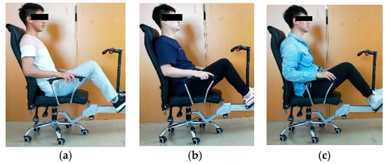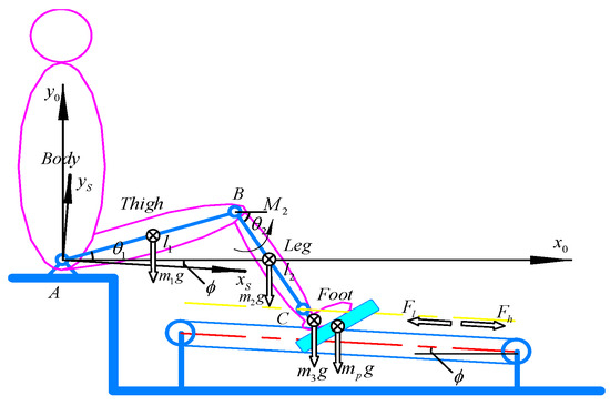 The human legs (thighs, legs, and feet) are regarded as rigid link. The foot on the pedal is always fixed in the same position (fixed pedal angle). Thus, the integral mechanism of the “human leg-slider” can be regarded as a crank-connecting rod mechanism. As shown in Figure 5, the human leg is simplified to a three-link rigid mechanism.