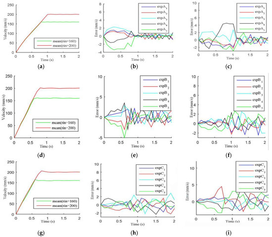 Five sets of experimental pedal speed sampling results. (a) Experiment A average speed difference. (b) Experiment A sampling speed difference (speed = 160 mm/s). (c) Experiment A sampling speed (speed = 200 mm/s). (d) Experiment B average speed difference. (e) Experiment B sampling speed difference (speed = 160 mm/s). (f) Experiment B sampling speed (speed = 200 mm/s). (g) Experiment C average speed difference. (h) Experiment C sampling speed difference (speed = 160 mm/s). (i) Experiment C sampling speed (speed = 200 mm/s).