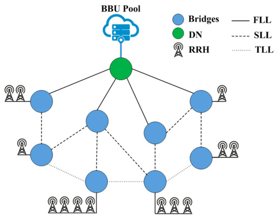 A MFH carries the digitized in-phase and quadrature (IQ) samples of baseband signals through the common public radio interface (CPRI) [8]. The CPRI is a non-packetized protocol that was specifically designed for the fronthaul networks by the leading telecom vendors, and cannot be integrated with other packetized transmissions unless a circuit (e.g., a wavelength) is reserved for it [9]. In this work, we consider a recent evolution of CPRI that is eCPRI (enhanced-CPRI) [10], which can packetize the IQ samples within Ethernet frames and is fully compatible with Ethernet systems. The eCPRI-based MFH networks are expected to deliver the throughputs of 10 Gbps, packet delay variations (PDVs) within 100 ns, and end-to-end (E2E) latency of less than 250 μs for all the RRHs streams [11,12]. The aforementioned requirements can only be fulfilled with the expensive and extremely high-capacity optical links. However, the cost of deploying such optical fronthaul bridged networks significantly increased the capital expenditure (CAPEX) and operational expenses (OPEX) for the network operators. As a result, the cost benefits of the C-RANs architecture could not be realized [13]. Thus, the implementation of low-cost MFH becomes a challenging issue in the C-RANs [14].