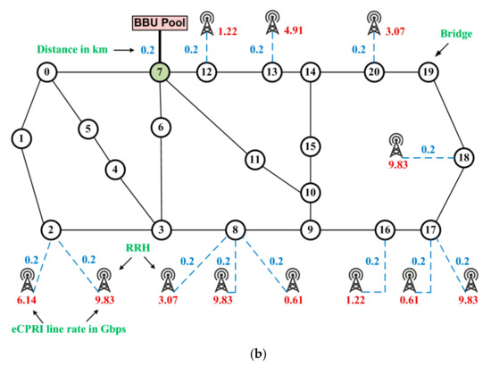 The RRHs are connected to bridges through a link of 0.2 km length at the bandwidth of 10 Gbps. It is considered that all the bridges are located within an area of 20 km2. The link distance between the consecutive bridges is randomly determined from 1 to 5 km similar to realistic networks [18]. The link bandwidth between two bridges is considered to be 10 Gbps. In each topology, the BBU pool is connected to a node where a maximum number of links are connected. In the considered scenarios, the BBU pool is connected to the bridging node-3 and to the bridging node-7 in COST239 and ARPA2 topologies, respectively. The link bandwidth between the BBU-DN is assumed as 100 Gbps and the link length is assumed as 0.2 km. Figure 4 shows the experimental setup to reflect the aforementioned configurations and parameters for simulating the fronthaul scenarios. As shown in Figure 4a,b, the RRHs are configured to support the cumulative eCPRI traffic of approximately 50 Gbps and 60 Gbps for COST239 and ARPA2 topologies, respectively. Analogous to this, the cumulative eCPRI traffic loads of 70 to 100 Gbps are formulated during the simulations for both topologies by randomly connecting the RRHs with different nodes at different line rates. The link length between the RRH bridges and DN-BBU pool is considered as 0.2 km. The link lengths between bridges and bridges would be determined randomly from 1 to 5 km. The bandwidth of all the links is considered to be 10 Gbps except for the link between the DN and the BBU pool, which has 100 Gbps of bandwidth.