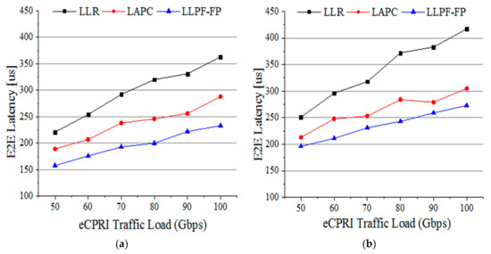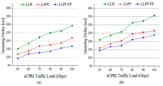 Figure 6a depicts the worst-case E2E latencies experienced by the eCPRI streams with the LLR, LAPC, and LLPF-FP schemes. It can be observed that the LLR resulted in high E2E latencies for COST239, which exceeded beyond the 250 μs limits once the eCPRI traffic load increased to 60 Gbps. Whereas, for ARPA2 topology, as shown in Figure 6b, the LLR scheme lacked the mechanism to transport even 50 Gbps of traffic, and resulted in intolerable E2E latencies. Our proposed LAPC algorithm improved the E2E latency performance in the considered EFBNs topologies as compared to existing schemes such as the LLR. The simulation result showed that the LAPC can transport up to 82 Gbps and 65 Gbps of traffic in COST239 and ARPA2 topologies, respectively, by fully satisfying the E2E latency constraints of the fronthaul systems. The LLPF-FP scheme further improved the performance of the EFBNs and enabled the successful transmission of eCPRI traffic up to 100 Gbps for COST239 while retaining the E2E latencies within the threshold. In ARPA2 topology—which has comparatively long routes and more numbers of intermediate bridges with respect to COST239—the proposed LLPF-FP scheme transmitted up to 85 Gbps of traffic without violating the threshold. This verifies the feasibility of our proposed scheme to transport the time-sensitive eCPRI streams in low-cost Ethernet fronthaul networks without deploying the expensive optical fronthaul networks. Under the considered scenario and based on the results for ARPA2 topology, with a successful transmission of 85% of fronthaul traffic through the low-cost Ethernet infrastructure, a significant amount of CAPEX and OPEX, which would be required to deploy the complete optical fronthaul networks, can be saved. Hence, in this case, only 15% of the traffic required transmission through high-capacity and expensive optical links. For networks such as COST239, almost all of the traffic can be transported through the Ethernet systems, which would be highly cost-effective.