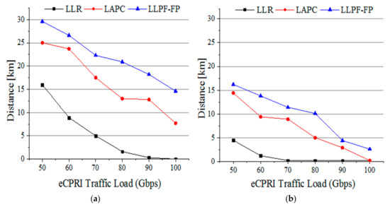 The results in Figure 7 show the distances that different schemes can support under different traffic load conditions based on the latency constraints. The distances are computed based on Equations (1)–(5). The proposed LAPC and LAPF-FP schemes outperform the LLR and considerably improve the distances supported by the fronthaul links. It can be observed that with the LAPF-FP scheme, the distances of the fronthaul segment can be increased up to 30 km for 50 Gbps of traffic, which reduced with the increase of traffic load, as shown in Figure 7a. In ARPA2 topology, as the number of intermediate bridges and distances between the RRHs and BBU pool has been increased as compared to COST239. As a result, the processing, transmission, queuing, and encapsulations delays at each bridging node would also be increased, which resulted in high E2E latencies based on Equation (4), and low fronthaul distances based on Equation (5). As shown in Figure 7b, the proposed LAPF-FP scheme can support fronthaul link distances from 3 km to 18 km for 50 Gbps to 100 Gbps of traffic, respectively. In contrast, the existing scheme can only support a maximum link distance of 4.5 km in Ethernet-based fronthaul bridged networks. The simulation results showed that in about 50% of cases, the proposed LAPF-FP scheme minimized the queuing delays and worst-case E2E latencies by more than 110 μs and 90 μs, respectively, compared to the LLR. In about 70% of cases, our scheme improved the link distances up to 35% compared to the LLR.
