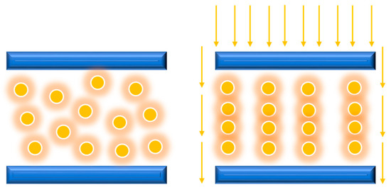 Oil and ferrous particles (20–50 microns in diameter) are the main components of Magnetorheological fluids [68], as shown in Figure 5. When a magnetic field is applied on the MR fluids, it affects their main characteristics, and their properties could be immediately changed or rearranged within a very short time (Millisecond). The main benefit of applying MRF Dampers is their quick response to the force variation (over 100 times per second faster response than the passive system). Furthermore, they are active and fully adjustable without consuming external power. Besides this, there are no moving parts in this system. The main disadvantage of the MRF dampers is the high cost of construction.