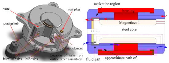 One of the restrictions of using linear dampers is sealing the system [77]. As the working mechanism of the linear MR damper fully depends on the pressure difference between the two sides of the piston, it means the pressure of at least one side is high and therefore needs good sealing. On the other hand, in a rotary MR damper, the need for sealing is eliminated since the pressure in rotary dampers is quite low; thus, it is much simpler to solve the sealing problem [78]. The other problems of linear MR dampers such as sedimentation and hard adjustment are solved in rotary dampers. Compared to a linear MR damper, the rotary MR damper generates a significant reduction displacement and device compactness and requires less space for the configuration [79]. A rotary MR damper is shown in Figure 7.