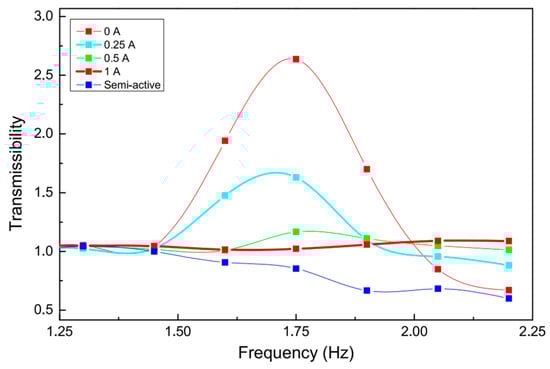 The experimental results of the transmissibility of the seat with MR damper [80].