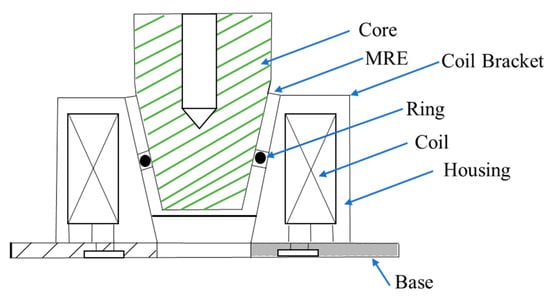 Both ER and MR fluid are useful just for a small frequency range, and out of that range they will lose their efficiencies. To expand the efficient frequency range, in a study by Du et al. [24], they suggested MR elastomers (MREs). Conversely, from MR/ER fluids, magnetorheological elastomers (MREs) have controllable damping capabilities [81]. MRE is a kind of composite which is formed by magnetized particles scattered with the alliance in a solid polymer such as rubber. The elastic behaviour of an MRE grows monotonically based on the magnetic field. Simultaneous to the removal of the magnetic field, the MRE quickly returns to its primary status [82]. These unique characteristics of MREs have pointed to a variety of uses such as tuned vibration absorbers [83,84]. This novel vibration isolator has potential in utilisation where the reinforced vibration properties are wanted. Study of MRE isolators in vibration attenuation of structural systems has been done in [85,86,87], and a model of an MRE isolator has been constructed and experimentally examined in [88]. The efficiency of the MRE isolator depends on some significant parameters, like the relative MR effect, the material’s strength and its life span. Figure 10 represents a schematic diagram of the mentioned MRE seat isolator using the fabricated MRE. As mentioned before, one of the restrictions of the MRF dampers is the cost of construction. According to the obtained results, MRE-based devices are comparatively low-priced and strong in comparison with other semi-active systems like MR dampers [81].