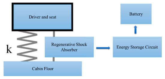 Another method to implement semi-active seat suspension is an energy regenerative seat suspension, which was suggested and built by Ning et al. [89]. The simplified layout of the regenerative seat suspension system is given in Figure 11. As shown, the vibration energy will be stored in a battery through a storage circuit. The regenerative shock absorber converts vibration energy into electrical energy through electromagnetic coupling and uses the electrical energy to generate electromagnetic damping force.