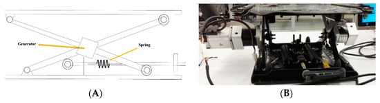 (A) Semi-active regenerative seat suspension schematic. (B) Seat suspension prototype [89].