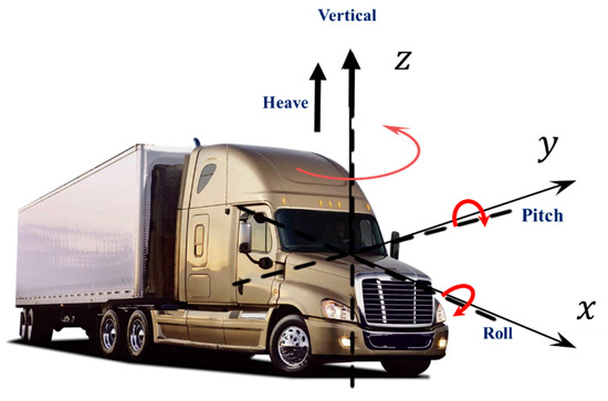 In 2015, a project was performed by EKBERG and HANSSON [97] at the Department of Applied Mechanics at the Chalmers University of Technology in collaboration with Volvo Group Trucks Technology [98]. The main purpose of this research was to improve ride comfort by using active and semi-active suspensions, with a focus on the vertical dampers. They examined the effects of vertical dampers on the ride comfort feature of a commercial truck through the use of active and semi-active cab suspensions based on the principle of individual control of each damper separately. By this method, the restoring force mainly depends on the state of the suspension itself and is independent of the other dampers and the overall motion of the cab. The benefits of this method are that it is easy to implement and easy to overview. Figure 14 presents the truck coordinate system that was considered to study damping forces in the model coordinates, i.e., heave, roll and pitch. According to the obtained results by EKBERG and HANSSON, the active control systems improve the ride comfort regardless of the road profiles while the semi-active control systems principally work well for the road profile that induces low levels of vibration.