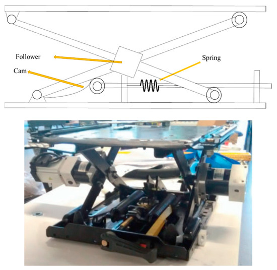 The roll vibration will be fully transmitted to the driver’s body in conventional single-DOF seat isolation systems and only the affected vibration in the vertical direction will be damped. A two-layer (integrated seat system) multiple-degrees-of-freedom seat suspension system was proposed by Ning et al. [53]. The efficacy of the multiple-DOF seat suspension system was examined by doing a series of both simulations and experimental test. The seat was constructed in two layers: the layer which is located on top of the seat is considered to be affected by vertical vibration in the z-axis, and the lower layer is designed for the roll vibration. A multiple-DOF seat suspension is shown in Figure 18, developed by Ning et al., presenting the bottom part of the multiple-DOF seat suspension as a mechanism for controlling the vertical vibration. As shown in Figure 19, a U-joint is connected to two actuators in the top layer.