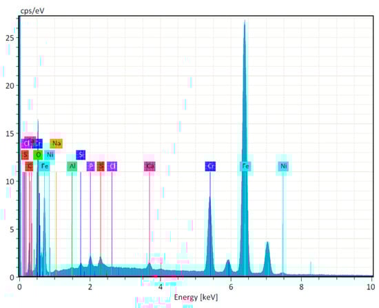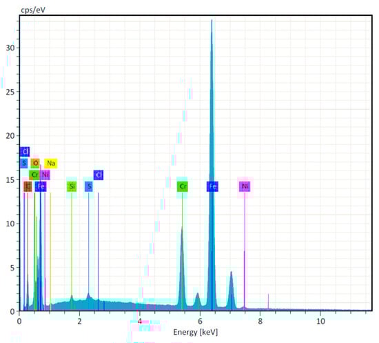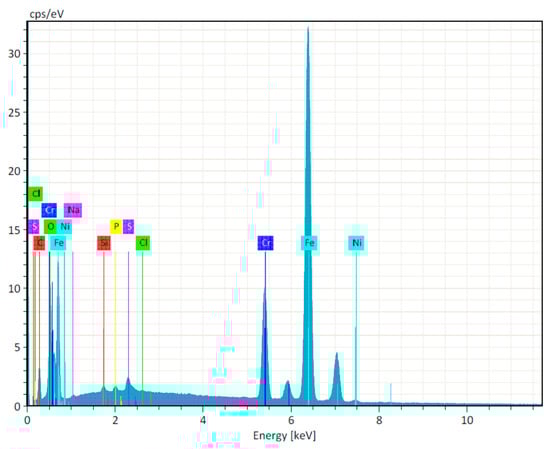 The spectroscopic analysis showed that the flat area of implant drills was composed of stainless-steel alloys with a high content of iron, nickel, and chromium (Figure 3).