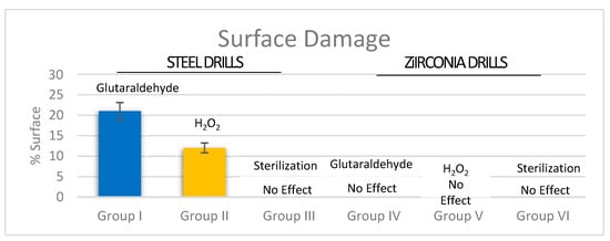 Summary of the drills surface area damaged by the testing processes. The disinfection processes generated significant surface corrosion compared to the zirconia drills (p < 0.01). The autoclave sterilization did not cause any alteration to the different drill surfaces.