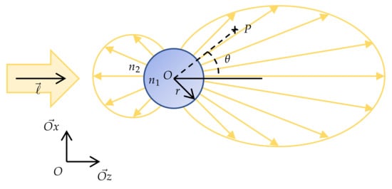 The particle studied is a sphere of radius r and refractive index (see Figure 2). This particle is placed in a host environment of refractive index in which a monochromatic plane wave with wavelength propagates with a wave vector such that . This incident wave meets the spherical particle, and the radiation is scattered in all directions as a result of this interaction. The polarization of the wave is identified by the scattering plane. The latter is defined by the direction of the wave vector , as well as the observation direction .