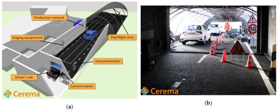 The PAVIN BP platform. (a) Exploded diagram of the infrastructure, presenting the 3 parts: the observation post, the tunnel section for night conditions, and the greenhouse section for day conditions; (b) day view with cars, work zone, and various signaling equipment.