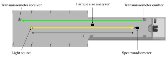 The light source was placed in front of the spectroradiometer at a distance D (see Figure 6). The spectroradiometer was positioned to target the light source. To prevent any condensation on the optics of the spectroradiometer, the latter was heated. The values of D varied from m to m in -m steps. The PSA was placed near the light source/spectroradiometer axis in order to limit errors due to the imperfect homogeneity of the fog. It was then calibrated.
