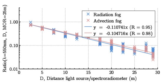 For both types of fog, the radiance as a function of wavelength , MOR, and distance D could therefore be obtained. The radiance is therefore expressed in the following form: