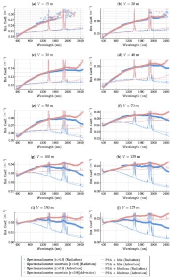 First of all, it can be noted that for both types of fog (advection and radiation), the spectroradiometer measurements (scatter-style crosses and circles) have the same behavior as the curves from the two models + PSA measurements (simple dashed line for the Mie model and continuous line for the MODTRAN model). This shows that the two methods and the sensors used agreed, showing differences in the extinction coefficient according to wavelength, MOR, and fog type. However, the model + PSA combination would tend to underestimate systematically the extinction coefficient compared to spectroradiometer measurement. This occurred especially for the densest fogs ( m). This may be due to the fact that the PSA would miss drops when confronted with extremely dense fogs. This was because the sensor performed filtering to prevent several drops from being counted at the same time. In the case of very dense fogs, these filters may have an impact on the measurement. Moreover, at wavelengths of 440–1600 nm and m, the extinction coefficient from the spectroradiometer measurements varied more than the extinction coefficient from the two models + PSA measurements. The PSA may underestimate fog droplets with a diameter between 2 and 5 m and overestimate droplets with a diameter higher than 5 m (see Figure 3a). In the case of radiation fog (blue curves) and an MOR greater than 100 m, underestimation of the extinction coefficient by the model + PSA measurement may also result from the fact that the sensor cannot detect drops whose diameter is less than 0.3 m. Again, all the drops may not be counted.