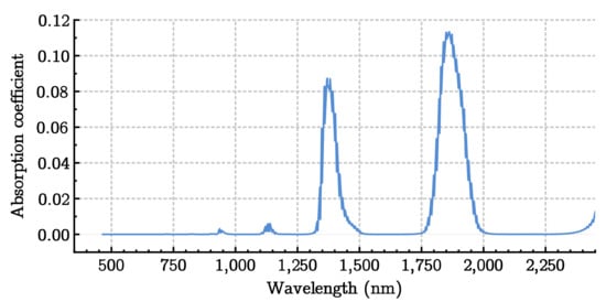 Concerning the comparison between the two models + PSA measurements (Mie and MODTRAN), it can be said that the two models were quite similar. However, the MODTRAN model tended to underestimate globally slightly the extinction coefficient compared to the Mie model, except for the molecular scattering peaks. This was due to the assumption of multiple scattering made by MODTRAN (as opposed to the assumption of single scattering made by the Mie model) [5]. On the other hand, it was interesting to see that the complex MODTRAN model made it possible to highlight extinction peaks around the wavelengths of 1340 nm–1440 nm and 1910 nm–1950 nm. This was due to the molecular absorption of , as we can see in Figure 10. Spectroradiometer measurements also showed the same instability in these areas. The latter had a much smaller amplitude than for MODTRAN + PSA measurements. However, this can be explained by the fact that the values were integrated over ranges of 10 nm in the case of the spectroradiometer. This result confirmed previous work [6].