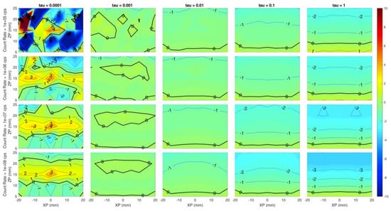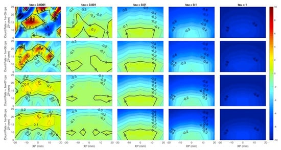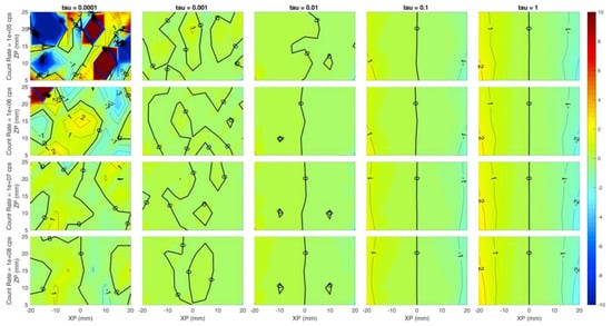 Figure 3 suggests a general high localization of the x coordinate in most of the conditions as the green color (indicating low error, close to 0 mm) is spread over most of the panels except for low regularization (τ = 10−4). This is expected, as a very small value of the regularization parameter leaves excessive room to the effects of the reconstruction noise. At the same time, the localization error is spatially more uniform for higher regularization: At a fixed count rate, the error dispersion tends to reduce as the contour lines are straighter and zones with different error value are merged together.