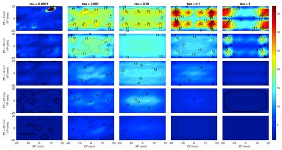 Figure 4 shows the localization on the z coordinate, i.e., the reconstructed z coordinate of the inclusion with respect to the simulated one. Similar conclusion to Figure 3 can be drawn for Figure 4, but it is worth noticing the low localization error (around 0 mm) even in depth (25 mm) for τ = 10−3, which seems to be the best value for the regularization parameter. This is a key aspect as the maximum probed depth is a typical issue when dealing with DO systems, and 25 mm is considered to be a significant value. Moreover, higher regularization values cause the inclusion to be reconstructed at shallower depths, as the negative (blue) error increases for a fixed z coordinate value (same row). As an example, let us consider the last row (count rate = 108 cps) and Zp = 15 mm. The error increases (in absolute value) from 0 mm at τ = 10−3 to −2 mm at τ = 10−1, and reaches −3 mm at τ = 1.