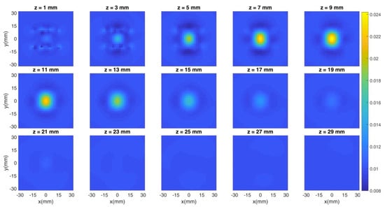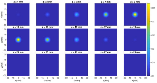 Cross sections of the simulated tomography at different depths. The inclusion is set in the center of the x-y plane and at a 10 mm-depth.