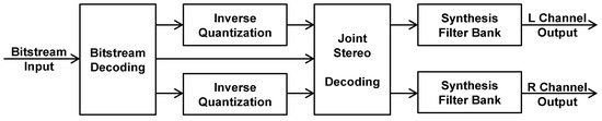 - In the decoder, the bitstream is unpacked, entropy coding is undone, and the quantized spectral values are mapped back to their original dynamic range and transferred back to a time domain output signal by the synthesis filterbank, i.e., a filterbank that behaves complementarily to the analysis filterbank that has been used by the encoder.