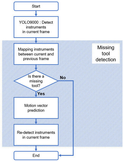 The missing tool detection process is subdivided into the following steps—a tool mapping and a tool redetection. In the tool mapping step, the presence of a missing tool is checked. To be specific, the tools identified in the current frame (t) are compared to that of the previous frame (t−1), based on the number and class. If one or more of the tools of this frame (t) have the same class as the tools of the previous frame (t−1), the tool that is closest to the tool of the previous frame (t−1) is considered as the same tool in the current frame (t). Conversely, if a tool only exists in the previous frame (t−1), it is determined that a missing tool exists.