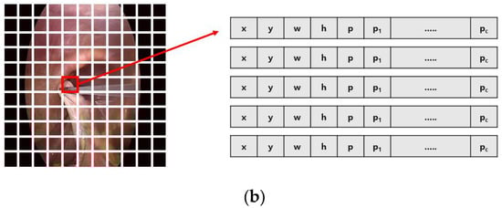 Difference between the first version (a) and the second version (b) of You Only Look Once (YOLO): input image is divided into grid cells (S × S). Then, prediction of each grid cell is encoded as a tensor. x and y are the center position, and w and h are the width and height of each bounding box. p is the probability of whether it is an object or not, and pc is the probability corresponding to each class.