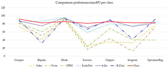 Moreover, the proposed method is deemed to be robust. In other words, the proposed method demonstrates the uniform and excellent performance in the detection of surgical instruments of all classes. Based on the results provided in Table 2 and Figure 4, it can be concluded that in comparison to other algorithms, the proposed method has a uniform mean average precision (mAP)—over 80—for all classes of surgical instruments, and the highest average mAP with respect to all considered surgical tools. As shown in Figure 4, while the performance of other algorithms with the similar mAP deteriorates for certain classes, the performance of the proposed algorithm is plotted as a flat graph, which confirms its high robustness.