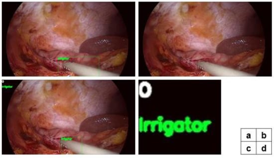 The results of the proposed method are shown in Figure 5. If a tool identified in the previous frame (a) is not found in the current frame (b), the missing tool detection algorithm is applied. (c) is the result of missing tool detection. After the presence of the missing tool is recognized, a white O symbol is displayed in the upper left corner of the image (c, d). Taking Figure 5 as an example, we can describe in more detail that an irrigator is detected in the previous frame (a), however, in the current frame, no surgical tools were detected through YOLO9000 (b). Therefore, through the surgical tool mapping applied on the previous frame and the current frame, it is recognized that the missing tool exists. This is indicated by the white O symbol in the upper left corner of the image. Thereafter, the missing irrigator is detected through the motion vector predicting step, and the class of the detected tool is displayed under the white O symbol.