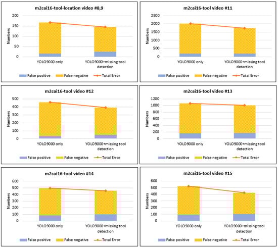 Figure 7 shows the error in each considered surgical video when using YOLO9000 only, and when using both YOLO9000 and missing tool detection. Each of the six pictures represents an error in each video. However, m2cai16-tool-location videos are displayed together because the total number of frames is small. The numbers on the vertical axis represent the number of errors. For example, if the number of surgical instruments erroneously detected in the same frame is two, the error is also registered as two. The bright blue region of the graph represents a false positive, and the yellow dot region represents a false negative. The orange line indicates the total number of errors. In each figure, the bar on the left shows the error when using only YOLO9000, and that one on the right shows the result obtained using missing tool detection together with YOLO9000.