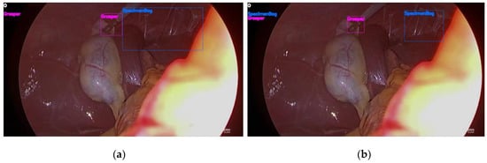 Example of errors in surgical tool detection using YOLO9000 and missing tool detection (a) The specimenbag was detected incorrectly in the previous frame, (b) The incorrectly detected specimenbag is judged as the missing tool, hence, it is redetected by applying the missing tool detection algorithm in the current frame.