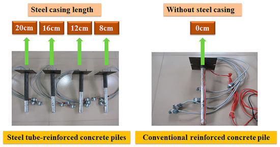 In this study, five model piles were prepared for the centrifugal model tests. Four model piles with steel casing were called steel tube-reinforced concrete piles; the model pile without steel casing was called conventional reinforced concrete pile. The steel casing length of four steel tube-reinforced concrete piles was 20 cm, 16 cm, 12 cm, and 8 cm, as shown in Figure 2.