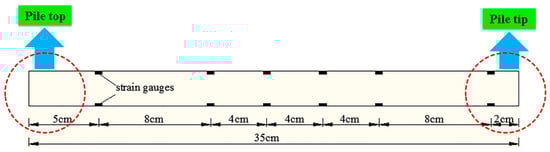 In order to ensure the integrity of the strain gauge during the testing process, the model piles were cut vertically; strain gauges were laid out in the model pile. After the strain gauges were affixed, the model piles were pasted and restored by epoxy resin, and the position of the pile shaft strain gauges were laid out as shown in Figure 3. Because the pile that enters the soil layer is 30 cm deep, the pile length is 35 cm, so the position of the first group of strain gauges is 5 cm from the top of the pile. The second to the fifth group of strain gauges are positioned according to the length of the steel casing. In order to save the number of strain gauges and reflect the strain near the bottom of the pile, the sixth group of strain gauges is arranged at 2 cm from the bottom of the pile.