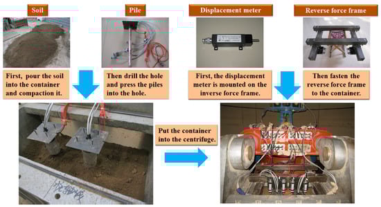 - First, the displacement meter was mounted on the inverse force frame to measure top displacement. Then the reverse force frame was fastened to the container by bolts. Finally, strain gauges, earth pressure cells and the displacement meter were connected with the centrifuge channel, which can obtain the data from the computer.