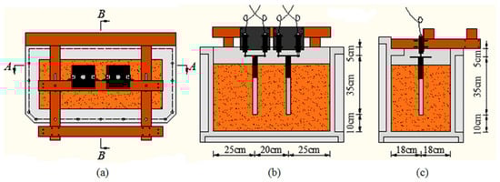 Figure 7. The position of the model piles: (a) Planar graph; (b) A-A section diagram; (c) B-B section diagram. - The container was put into the centrifuge by hoisting machine.