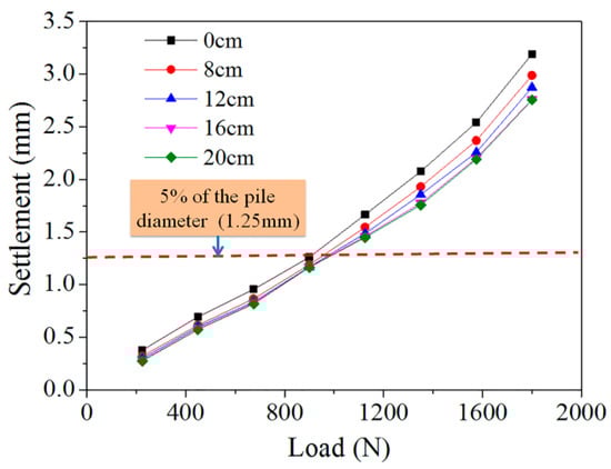 As shown in Figure 9, under the same settlement, the longer the length of the steel casing, the greater the load the pile can bear. The load–settlement curve is always used to judge the ultimate bearing capacity of piles. There are two different criteria. In the first, the ultimate bearing capacity is the load when the settlement mutates. In the second, the ultimate bearing capacity refers to the load corresponding to the settlement of 5% of the pile diameter [35]. Since the settlement in Figure 9 does not mutate, the second method is used to determine the ultimate bearing capacity of piles.