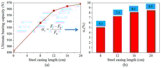 As shown in Figure 10, when the steel casing length is 0 cm, 8 cm, 12 cm, 16 cm, and 20 cm respectively, the vertical ultimate bearing capacity is 892.6 N, 937.8 N, 957.5 N, 964.6 N, and 968.2 N. With the increase of the steel casing length, the vertical ultimate bearing capacity of steel tube-reinforced concrete piles shows a gradual increasing trend. The main reason is that the diameter of the steel casing is slightly larger than the borehole size, which has an extrusion effect on the soil, and with the increase of the length of the steel casing, the extrusion area of the steel casing and the soil increases, and the larger the shaft resistance that can be obtained. When the steel casing length is less than 12 cm, the vertical ultimate bearing capacity of steel tube-reinforced concrete piles increases rapidly, and when the steel casing length is greater than 12 cm, the vertical ultimate bearing capacity of steel tube-reinforced concrete piles increase slowly. Additionally, when the steel casing length of steel tube-reinforced concrete piles is 8 cm, the lifting rate of ultimate bearing capacity is 5.1%, see Figure 10 and Equation (2), and it can be seen that the existence of the steel casing can improve the ultimate bearing capacity. When the steel casing length of steel tube-reinforced concrete piles is 16 cm, the lifting rate of ultimate bearing capacity is 8.1%; it is only 0.8% more than steel tube-reinforced concrete piles whose steel casing length is 12 cm. The main reason is that when the length of the steel casing exceeds a certain value, this means that the growth of length has not had much effect on the bearing capacity.