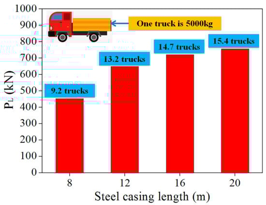 According to Table 1, a similitude ratio of force is 1: n2 and n is 100 in this study, so the prototype force is 10,000 times the model force. When the steel casing length of model piles is 0 cm, 8 cm, 12 cm, 16 cm, and 20 cm respectively, the vertical ultimate bearing capacity of model piles is 892.6 N, 937.8 N, 957.5 N, 964.6 N, and 968.2 N. So when the steel casing length of prototype piles is 0 m, 8 m, 12 m, 16 m, and 20 m, respectively, the vertical ultimate bearing capacity of prototype piles is 8926 kN, 9378 kN, 9575 kN, 9646 kN, and 9682 kN. The lifting value of ultimate bearing capacity is 452 kN, 649 kN, 720 kN, and 756 kN, see Equation (3). If there is a truck whose quality is 5000 kg, the lifting value of the ultimate bearing capacity can be converted into gravity for 9.2 trucks, 13.2 trucks, 14.7 trucks, and 15.4 trucks respectively, as shown in Figure 11.
