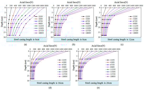 Axial force of steel tube-reinforced concrete piles with different steel casing lengths: (a) Steel casing length is 0 cm; (b) Steel casing length is 8 cm; (c) Steel casing length is 12 cm; (d) Steel casing length is 16 cm; and (e) Steel casing length is 20 cm.