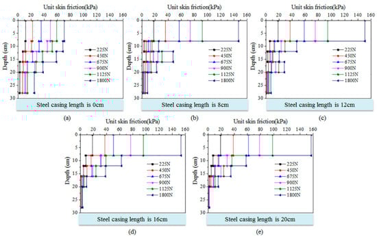 Unit skin friction of steel tube-reinforced concrete piles with different steel casing lengths: (a) Steel casing length is 0 cm; (b) Steel casing length is 8 cm; (c) Steel casing length is 12 cm; (d) Steel casing length is 16 cm; and (e) Steel casing length is 20 cm.