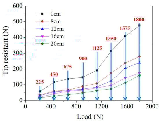 As shown in Figure 14, the tip resistance of the pile increases gradually with the increase of pile top load; when the pile top load is small, the tip resistance of pile changes slowly; when the pile top load is large, the tip resistance of pile changes sharply. The main reason is that when the pile top load is small, the pile top load is mainly transmitted to the soil through the form of shaft resistance; when the pile top load exceeds a certain value, the shaft resistance has been fully utilized, and the pile top load will be transmitted to the soil mainly through the form of tip resistance [36]. In addition, the tip resistance of the pile without steel casing is larger than the steel tube-reinforced concrete piles with different steel casing lengths. The main reason is that pile top load is utilized through the form of shaft resistance and tip resistance; the shaft resistance of the pile without steel casing is smaller than the steel tube-reinforced concrete piles with different steel casing lengths, so the tip resistance of the pile without steel casing is larger than the steel tube-reinforced concrete piles. Moreover, the longer the steel casing is, the greater the shaft resistance is, and so the smaller the tip resistance is. In a word, the presence of steel casing will reduce the tip resistance of pile foundation.