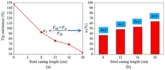 As shown in Figure 15, when the steel casing length is 0 cm, 8 cm, 12 cm, 16 cm, and 20 cm respectively, the tip resistance under the ultimate bearing capacity is 147.0 N, 92.8 N, 76.1 N, 69.1 N, and 53.0 N; the ratios of the tip resistance to the ultimate bearing capacity are 16.5%, 9.9%, 7.9%, 7.2%, and 5.5%. With the increase of steel casing length, the tip resistance of steel tube-reinforced concrete piles shows a gradual decreasing trend. The main reason is that the diameter of the steel casing is slightly larger than the borehole size, which has an extrusion effect on the soil, and with the increase of the length of the steel casing, the extrusion area of the steel casing and the soil increases, and the larger the shaft resistance that can be obtained. Because the bearing capacity is composed of shaft resistance and tip resistance, the tip resistance decreases as the length of the steel casing increases. When the steel casing length is 8 cm, 12 cm, 16 cm, and 20 cm respectively, the reduction rate of the tip resistance under the ultimate bearing capacity is 36.9%, 48.2%, 53.0%, and 63.9%, see Figure 15 and Equation (7). From the above research, it can be seen that the existence of steel casing will greatly reduce the tip resistance of piles.