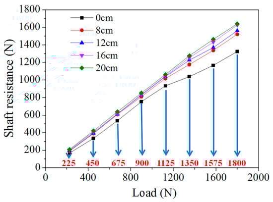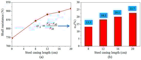 As shown in Figure 17, when the steel casing length is 0 cm, 8 cm, 12 cm, 16 cm, and 20 cm respectively, the shaft resistance under the ultimate bearing capacity is 745.6 N, 845.0 N, 881.4 N, 895.5 N, and 915.2 N, and the ratios of the shaft resistance to the ultimate bearing capacity are 83.5%, 90.1%, 92.1%, 92.8%, and 94.5%. With the increase of steel casing length, the shaft resistance of steel tube-reinforced concrete piles shows a gradual increasing trend. The main reason is that the diameter of the steel casing is slightly larger than the borehole size, which has an extrusion effect on the soil, and with the increase of the length of the steel casing, the extrusion area of the steel casing and the soil increases, and the larger the shaft resistance that can be obtained. When the steel casing length is 8 cm, 12 cm, 16 cm, and 20 cm respectively, the lifting rate of the shaft resistance under the ultimate bearing capacity is 13.3%, 18.2%, 20.1%, and 22.7%, see Figure 17 and Equation (9). From the above research, it can be seen that the existence of steel casing will increase the shaft resistance of the piles. However, when the length of the steel casing exceeds 12 cm, the increase of the length of the steel casing has little effect on the shaft resistance.