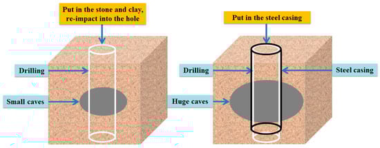 Moreover, there are lots of loess caves and karst caves in China [37]. When a cave is encountered during an impact into a hole before forming a bored pile, if the cave is small and the leakage is less, it can be backfilled through the stone and clay, re-impact into the hole. If the cave is huge and the leak is serious, it is necessary to use a steel casing to clog the cave [38], as shown in Figure 18.