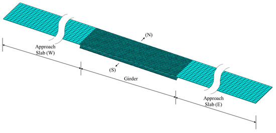 In this study, a finite element model (FEM) was used to obtain training and test data for the ANN. If measured data are available, a more realistic prediction will be possible, but as mentioned in Section 1, measuring displacement is not easy. The motivation for this study is developing another method to predict displacement. Therefore, an FEM verified with experimental values was used as an alternative. It is assumed that the results analyzed from the verified FEM correspond to the actual data. In order to carry out the finite element analysis (FEA), a simple supported slab-and-girder bridge was selected. The span of the slab was set to 36 m and the width of the slab to 15 m (Figure 1a). It is assumed that the bridge carried four lanes of traffic, two in each direction. I-shaped steel girders were used (Figure 1b). The unit weight of the concrete slab is 2300 kgf/m3 and the modulus of elasticity is 30 GPa. Also, the unit weight of the steel girder is 8000 kgf/m3 and the modulus of elasticity is 200 GPa. For the loads applied to the bridge, only the vehicle load was considered. Dynamic analysis was performed assuming that all materials are within the elastic range and are homogeneous and isotropic. The commercial program ABAQUS for FEM was used. Three-dimensional solid elements were used for the bottom slab of the bridge, and three-dimensional shell elements were used for the girders. In order to analyze the dynamic behavior due to the passing of the vehicle load over the bridge, it is modeled as shown in Figure 2. At both ends of the bridge, approach portions were modeled to minimize any numerical problems that might occur between the bridge and the entrance as a vehicle moved onto the bridge. The numerical model used was verified by comparing it to experimental values under static and dynamic loads [41,42,43].