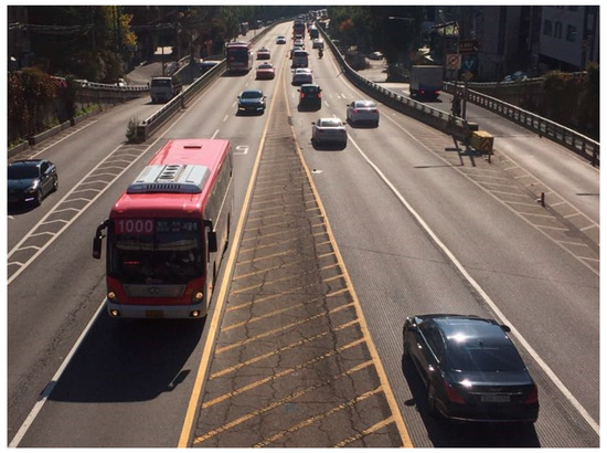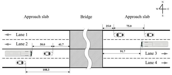 In order to describe the distribution of the vehicles as near to the actual situation as possible when loading the vehicle data into the FEM, a camera was installed in a fixed position in front of the starting point of the actual bridge for measuring (Figure 3), and the actual vehicle types and headways (i.e., interval times) were collected. Although the FEM used in this study and the actual bridge for measuring are not identical, it is assumed that it does not have a significant effect on the prediction result since the measured data was applied to Pearson Type III distribution, a probabilistic theory of general traffic flow. The vehicle types are assumed to be passenger cars, buses, or trucks. Table 1 shows the measured results by lane.