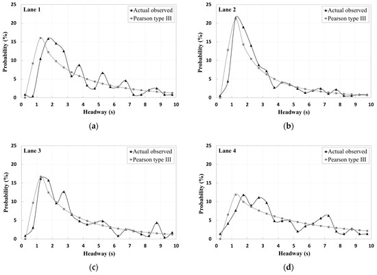 Statistics were also introduced to generalize the measured headway values of the vehicles. The traffic situation was generalized using Pearson Type III theory assuming the most general intermediate flow of traffic [48]. Pearson Type III theory is a generalized function of the gamma distribution and is often used to describe traffic conditions [49]. The Pearson Type III probability density function at arbitrary headway t is given by Equation (1).