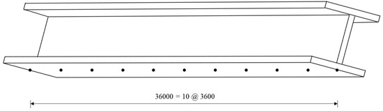 The load scenarios created as described in Section 2.2.2 were loaded into the FEM, and FEA was performed. Strains and displacement measurements were obtained at 11 locations at uniform intervals of 3.6 m below the flange of each girder, as shown in Figure 7. The center point is included as a measurement point because the largest displacement generally occurs at the center of the girder. Both ends of the beam were included to confirm that the strain and displacement at the support points in the simple supported beam are zero. Thus, a total of 55 strain (11 points × 5 girders, input) and displacement (11 points × 5 girders, output) measurement points were set. That is, one data set contains 55 strains and 55 displacements. The FEA for 25 scenarios for each speed was performed using the load scenarios created as described in Section 2.2.2. The value of Δt was 0.01 s, and the vehicles were loaded for a total of 8 s so that many vehicles could completely pass across the bridge. Thus, 800 data sets per scenario was obtained. Table 2 shows the amounts of training and test data obtained.
